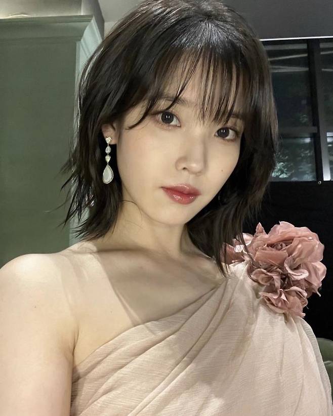 중단발 기장의 허쉬컷 헤어를 한 아이유. 허쉬컷 스타일은 청순하면서 힙한 느낌을 낼 수 있어서 깨끗한 이미지의 셀럽들도 선호하는 스타일이에요.