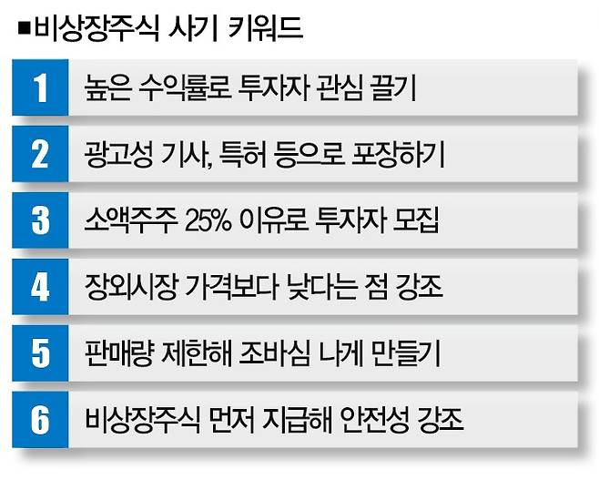 사실 비상장주식 사기의 수법은 비슷비슷하다. 상장 가능성이 없는 기업을 곧 상장할 기업으로 포장한다. 그러면서 지금 투자하면 원금의 5~6배에 달하는 수익을 올릴 수 있다고 투자자를 속인다.