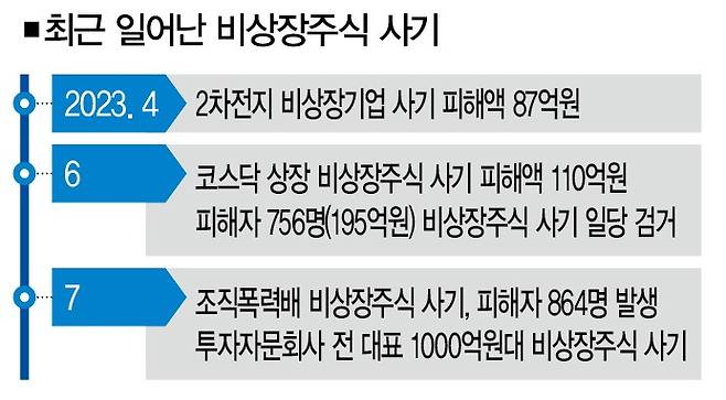 최근에는 영화 '기생충' 등에 투자한 유명 투자전문업체의 전 대표가 연루된 비상장주식 사기 사건이 터졌다. 이 회사 대표였던 A씨는 미등록 투자자문회사를 세운 후 비상장주식 투자로 월 수익률 5∼6%를 보장한다고 속여 1000억원가량의 투자금을 모은 혐의를 받고 있다. 앞선 6월에도 700명의 피해자가 발생한 비상장주식 사기 사건이 터졌다.