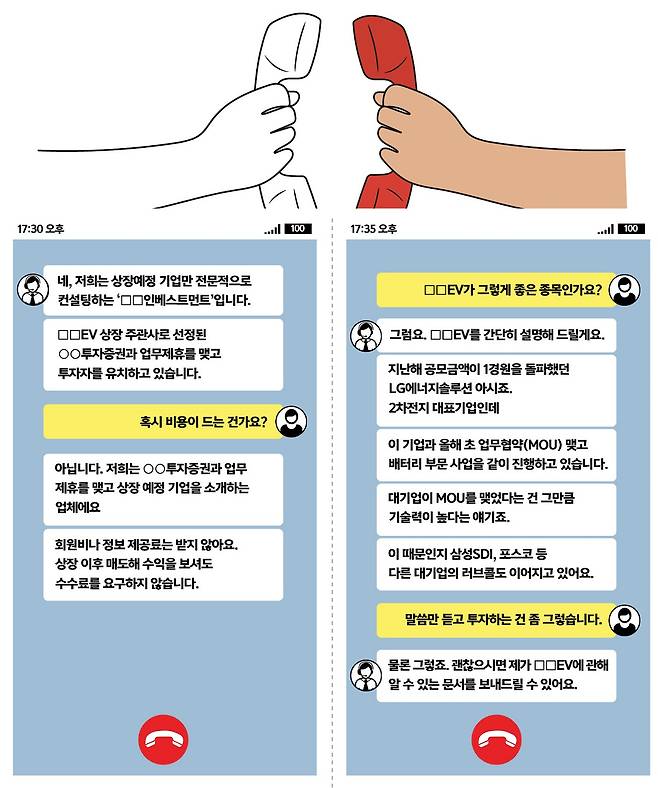상담원 : "네, 저희는 상장예정 기업만 전문적으로 컨설팅하는 '인베스트먼트'입니다. EV의 상장 주관사로 선정된 ○○투자증권과 업무제휴를 맺고 투자자를 유치하고 있습니다."