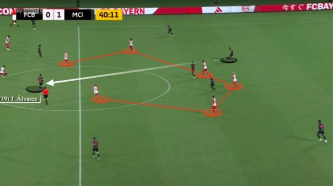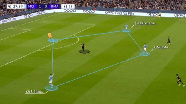 매체가 공개한 화면을 보면 맨시티는 최전방에 5명의 선수를 배치했다. 이날 최전방에 위치한 훌리안 알바레스를 포함해 잭 그릴리쉬, 제임스 매카티, 베르나르두 실바 그리고 윙백으로 경기에 나선 카일 워커가 전진했다. 중원에는 마테오 코바시치, 리코 루이스가 호흡을 맞췄다. 수비 라인은 나단 아케, 후벵 디아스, 존 스톤스가 위치했고, 에데르송은 수비 라인 사이에서 센터백들과 패스를 주고받았다.