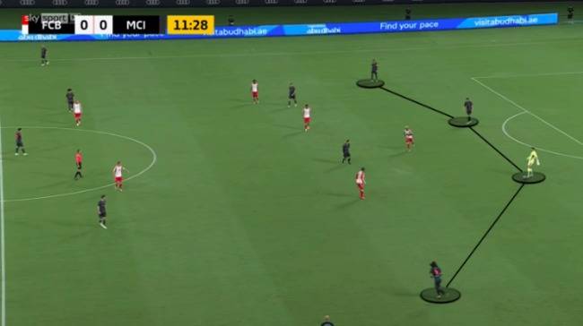 수적 우위를 전방과 후방에서 모두 가져갈 수 있는 전술이다. 맨시티는 후방 빌드업 과정에 총 6명이 관여하게 된다. 뮌헨 입장에서 당혹스러울 수밖에 없다. 매체가 공개한 경기 장면을 보면 뮌헨은 총 4명의 선수가 전방 압박을 펼치지만, 6명을 상대로 전방 압박이 성공하기란 매우 어렵다.