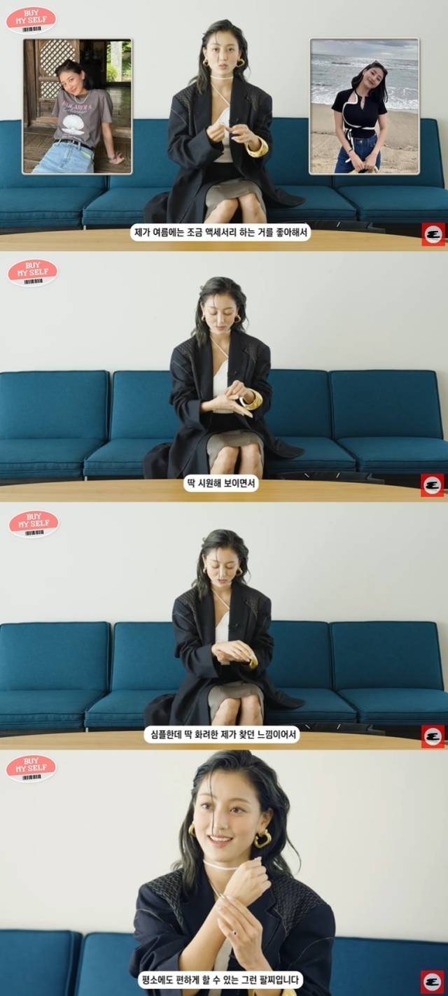 그 다음 지효가 소개한 아이템은 팔찌. 지효는 “여름에는 악세사리 하는 것을 좋아한다. 심플한데 화려한 팔찌를 사고 싶었는데, (이 팔찌가) 딱 시원해 보였다. 또 심플하면서도 화려해 보이기도 했다. 그래서 바로 구매했다. 잘 하고 다닌다”고 악세사리를 소개했다.