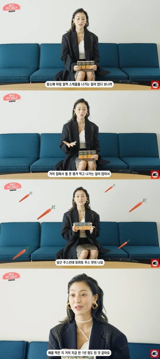 이어 “건강하면서 쉽게 먹을 수 있고, 바로 후루룩 나갈 수 있는 것을 찾다가 이 야채 주스를 발견했다. 당근 주스인데 토마토 맛이 난다. 그래서 거부감도 없다. 나는 프레시한 느낌의 음식을 좋아하는 편이라 오래 오래 (당근주스를) 잘 챙겨 먹고 있다. 이 주스를 먹은 지 1년 정도 됐다. 매일 먹지는 않지만 생각날 때마다 하나씩 꺼내먹는 편”이라며 주스를 소개했다.