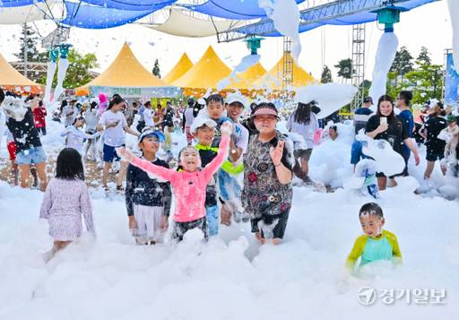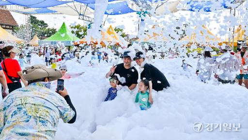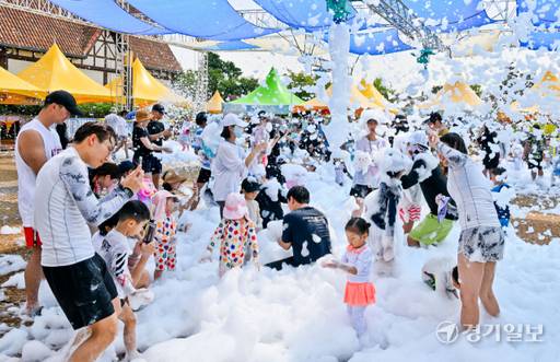 징검다리 연휴 마지막날인 15일 오후 수도권에 폭염이 계속된 가운데 안성시 팜랜드를 찾은 시민들이 버블&버블 행사에서 뿌려지는 비눗방울을 온몸에 맞으며 즐거운 한때를 보내고 있다.