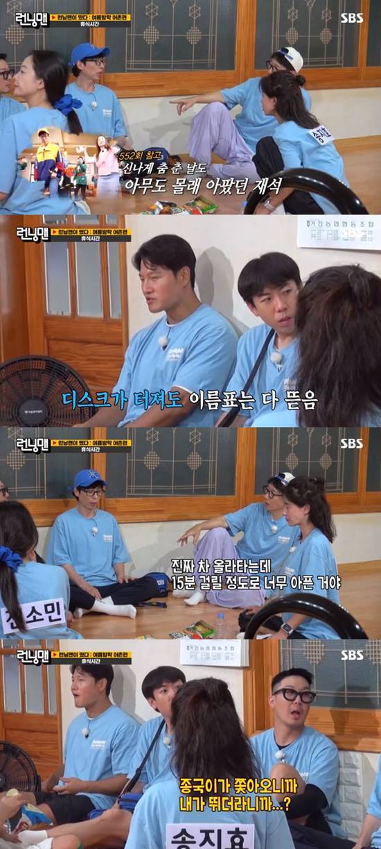 지석진은 "나도 디스크 터지고 와서 이틀 촬영했다. 차에 올라탈 때 15분 걸릴 정도로 너무 아팠다"라며 입을 열었다. 그러면서 그는 "근데 종국이가 쫓아오니까 내가 뛰더라"라며 디스크가 터져 몸이 성치 않았을 때도 웃음에 늘 진심인 모습을 보였다.