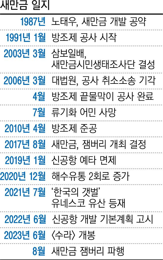 2006년 대법원 판결로 방조제 공사가 끝난 뒤 새만금은 세간의 관심에서 멀어졌다. 그사이 강 하구 모래를 퍼올려 갯벌을 메우는 일에 매년 7000억~8000억원의 세금이 “녹아 없어졌다”. 2023년 갯벌의 존재를 새삼 일깨운 두 사건이 있었다. 다큐멘터리 영화 <수라>의 개봉과 세계스카우트잼버리 대회 개최다. 영화는 갯벌이 아직 살아 있다는 걸 보여줬다. 많이 줄어들었지만 여전히 남아있고, 그곳에서 생명들이 끈질기게 살아가고 있으며, 그 아름다움과 소중함을 기록하는 사람들이 있다.