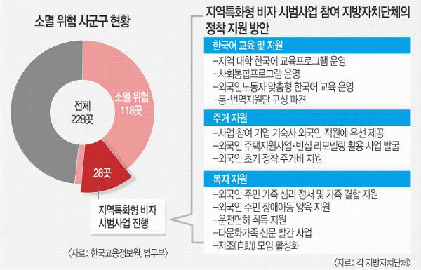 15일 국민일보가 지역특화형 비자 시범사업에 참여 중인 6개 시도를 상대로 입수한 사업계획서(경남·경북·전남·전북·경기도 연천 등은 정보 비공개)에 따르면 지자체들은 주거와 복지, 언어 지원을 통한 외국인 정착지원을 꾀하고 있다. 다문화 정책 차원에서 쌓은 인프라를 활용하겠다는 선언도 공통적이다.