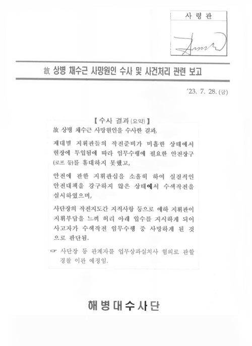 조사 결과 요약은 사단장부터 대대장까지 고위 장교들 혐의에 주목했고, 하급 간부은 아예 언급하지 않았습니다.