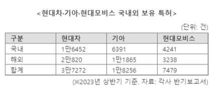 현대차·기아·현대모비스 등 현대차그룹 3개 계열사의 국내외 특허 보유 건수가 6만건을 돌파한 것으로 나타났다.