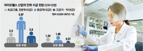 업계에선 앞으로가 더 큰 문제라는 지적이 나온다. 정부의 ‘바이오헬스 인재양성 방안’에 따르면 올해부터 2027년까지 5년간 10만8700여명의 신규 인력이 바이오헬스 산업에서 필요한 것으로 전망됐으나 같은 기간 해당 산업으로 공급되는 신규 인력은 3만4000만에 그칠 것으로 예상됐다. 이 가운데 석·박급 고급 인력은 2만6000여명이 필요하지만 5100여명만 신규 진출할 것으로 나타났다.
