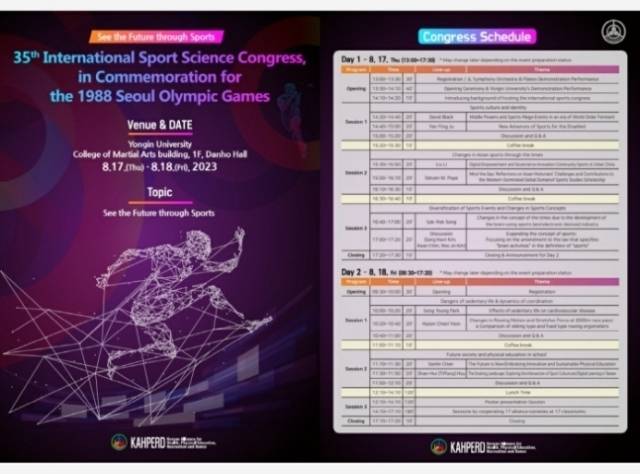 18일에는 좌식생활의 위험성_조정운동역학(박송영, University of Nebraska at Omaha; 윤현철, Kokushikan University), 미래사회와 학교체육(Senlin Chen, Louisiana State University; Shan-Hui, National Cheng Kung University)이라는 주제로 발제와 토론이 열린다. 3부 세션에서는 16개 협력학회와 아시아태평양체육학회의 학회별 포스터 및 구두 발표가 진행된다.