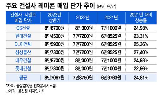 16일 국내 주요 건설사(GS건설, 현대건설, DL이앤씨, 삼성물산, 대우건설, 롯데건설)들이 금융감독원에 제출한 반기보고서에 따르면 레미콘 평균 매입단가(원/㎥)는 2021년 6만9763원에서 올 상반기 8만7067원으로 24.81% 올랐다.