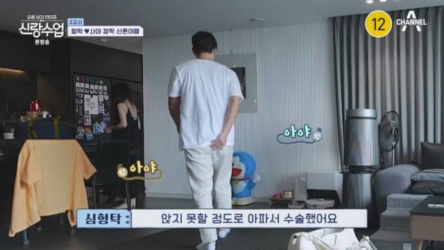 그러자 심형탁은 "일본 결혼 마지고 오니까 엉덩이 쪽이 앉지 못할 정도로 아파서 수술했다. 스트레스, 피로로 인해 살이 빠지면서 면역력이 저하된 게 엉덩이로 와서"라고 설명했다.