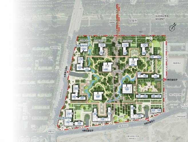 마지막으로 양재천과 단지가 바로 맞닿아 있는 입지적 장점을 살려 친환경 단지 배치를 계획했다. 양재천변 주동의 간격을 넓혀 공원이 단지 내 조경과 하나로 이어지는 열린 배치를 계획하고, 저층부에 개방형 주민공동 이용시설 등 수변특화공간 도입을 유도한다.