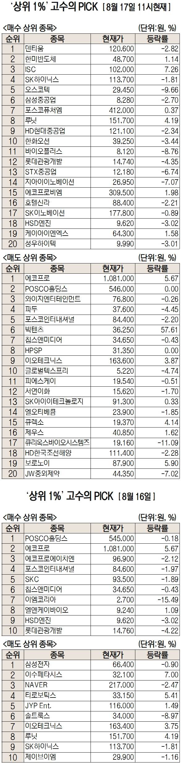 미래에셋증권은 자사 고객 중에서 지난 1개월간 수익률 상위 1% 투자자들의 매매 종목을 집계해 실시간·전일·최근 5일 기준으로 모바일트레이딩시스템(MTS)상에서 공개하고 있다. 이 통계 데이터는 미래에셋증권의 의견과 무관한 단순 정보 안내이며, 각각의 투자자 개인에게 맞는 투자 또는 수익 달성을 보장하지 않는다. 또 테마주 관련종목은 이상급등락 가능성이 있으므로 유의해야 한다.