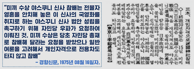 우리 언론이 본격적으로 문제제기를 한 것은 1975년 8월 15일, 미키 다케오 총리 때였습니다. 공식 참배는 아니습니다. 당시 기사를 보면, 미키 전 총리는 총리 자격이 아닌 개인 자격으로 신사를 방문했고, 전용차도 이용하지 않았다고 합니다.
