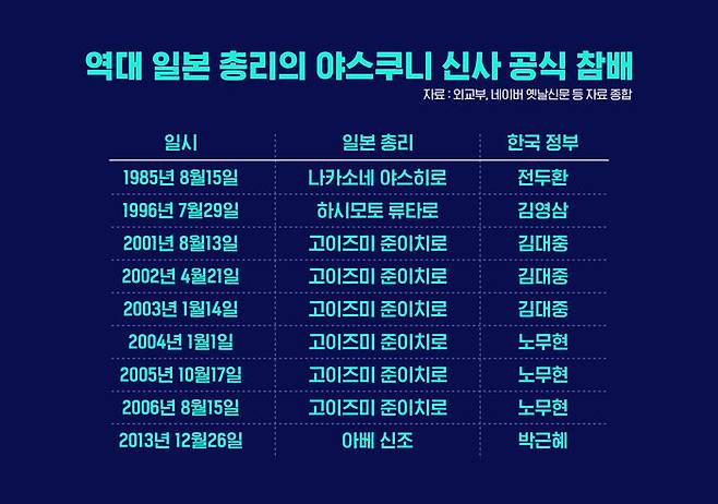 위 표를 보시면, 일본 현직 총리가 야스쿠니 신사를 직접 참배한 경우는 고이즈미 총리가 6번으로 가장 많았습니다. 아베 전 총리는 2013년 12월 한 번 참배했습니다. 참고로 아베 전 총리는 2020년 9월 신사를 직접 참배했지만, 그때는 총리에서 퇴임한 직후 신사를 찾은 경우라 현직 총리의 참배에는 포함하지 않았습니다. 야스쿠니 신사 참배 문제는 고이즈미 전 총리가 불쏘시개 역할을 했다고 볼 수 있습니다.