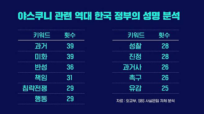 지금까지 성명에서 위의 키워드가 쓰인 방식은, '과거'의 '침략 전쟁'을 '미화'한 것에 '유감'을 나타낸 뒤, '책임'있는 인사들의 '성찰'과 '과거사'에 대한 '진정'한 '반성'을 '행동'으로 보여줄 것을 '촉구'하는 식이 대부분이었습니다.
