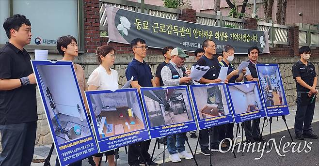 | ▲ 대전아파트경비노동자권리찾기사업단은 17일 오후 대전고용노동청 앞에서 기자회견을 열고 "대전노동청은 공동주택 휴게실 전면 지도 점검을 실시하고, 대전시와 각 구청은 휴게시설 지원 대책을 마련하라"고 촉구했다. |
