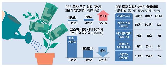사모투자펀드(PEF) 운용사가 경영권을 보유한 국내 상장사의 올 2분기 영업이익이 전년 동기 대비 2배 이상 증가했다. 같은 기간 코스피 시가총액 50대 기업(금융사 제외)의 영업이익이 반 토막이 난 것과 대조된다. PEF가 이들 포트폴리오를 대상으로 진행하는 매각 작업에서, 2분기 호실적이 유리하게 작용할 것으로 관측된다. 17일 국내외 PEF가 투자한 9개 상장사의 올해 상반기 보고서를 분석한 결과 상장사들의 2분기 매출 합이 4조4391억여 원으로 전년 동기 대비 9.7% 늘었다. 같은 기간 영업이익 합은 1189억원에서 2520억원으로 111% 증가했다. 분석 대상은 커넥트웨이브(MBK파트너스), 한온시스템·케이카·쌍용C&E(한앤컴퍼니), 한샘·하나투어·에이블씨엔씨(IMM PE), 락앤락(어피너티에쿼티파트너스), 클래시스(베인캐피털) 등 9개사이며, JKL파트너스가 보유한 롯데손해보험 등 금융사는 제외했다.