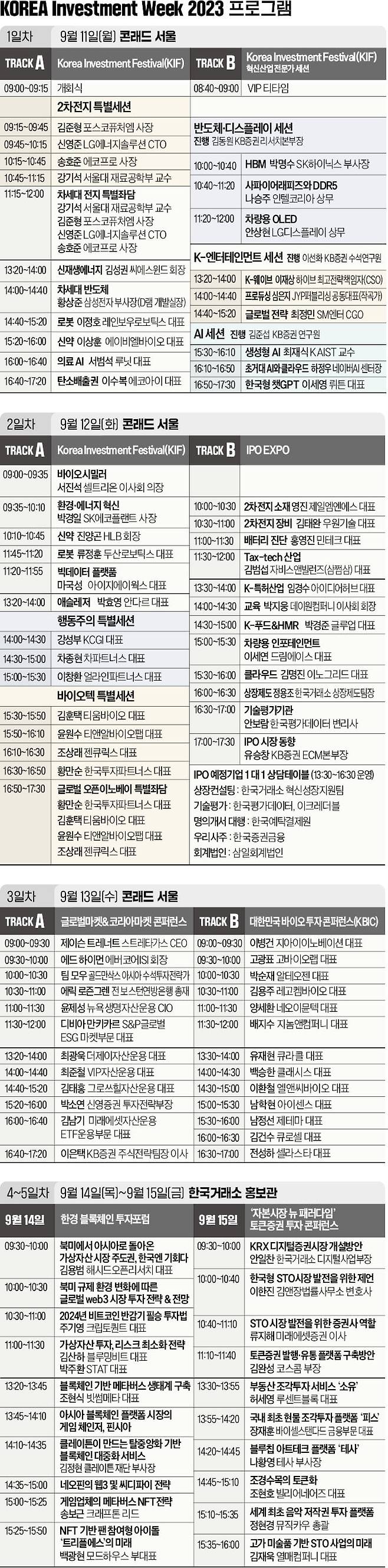 2차전지, 반도체, 인공지능(AI), 로봇, 엔터테인먼트, 바이오 등 혁신산업 최전선에서 뛰는 최고경영자(CEO)가 9월 11~15일 한자리에 모입니다. 한국경제신문이 KB증권, 한국거래소와 함께 개최하는 ‘코리아 인베스트먼트 위크 2023(KIW 2023)’에 참석해 성장 전략을 제시합니다. 투자자들과 소통하면서 혁신의 미래도 공유합니다. 혁신기업 CEO와 산업·투자 전문가만 100명에 달하는 사상 최대 투자 서밋입니다. 9월 11~13일엔 서울 여의도 콘래드호텔 그랜드볼룸에서, 14~15일엔 한국거래소 홍보관에서 진행됩니다.