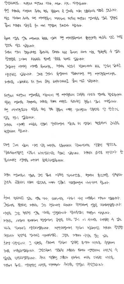 현재 많은 언론 매체의 보도로 인해 팬 여러분께서 혼란스러운 마음을 안고 계실 것으로 알고 있습니다. 저희 역시 눈덩이처럼 불어나는 오해와 비난 속에서 차마 말로 표현할 수 있는 참담함을 느끼며 하루하루 힘겨운 날들을 보내고 있습니다. 그렇지만 이러한 어려움 속에서도 저희는 반드시 밝혀내야 하는 진실이 있다고 생각하고 있습니다. 그리고 그것이 투명하게 밝혀지면 팬 여러분들께서도 저희를 이해하고 더 크게 응원해주시리라고 굳게 믿고 있습니다.