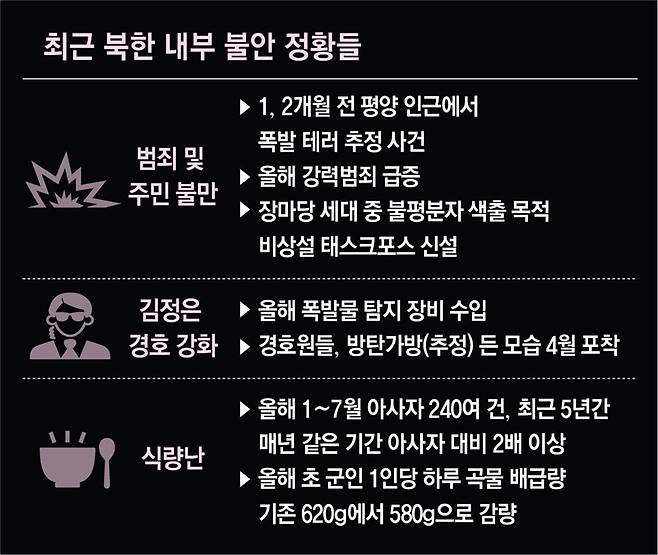 북한 내 정세 불안 정황들이 이어지는 건 신종 코로나바이러스 감염증(코로나19) 이후 가중된 식량난과 연관돼 있는 것으로 풀이된다. 소식통은 “특히 북한이 코로나19를 명분으로 불법 장마당을 강하게 통제하는 식량 정책을 추진하면서 식량난이 가중됐고 주민들 불만이 극대화됐다”고 했다.