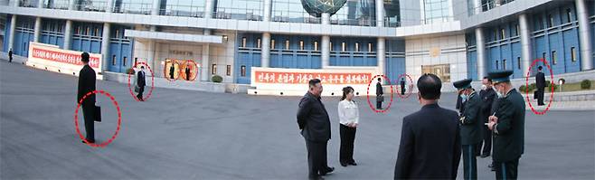 | 김정은 주위에 검은 가방 든 경호원 집중배치 올해 4월 19일 국가우주개발국을 방문한 김정은 북한 국무위원장과 딸 주애 주위로 다수의 경호원이 방탄가방으로 추정되는 검은 가방(붉은 원 안)을 들고 서 있다. 이날은 기시다 후미오 일본 총리가 선거 유세장에서 폭발물 테러를 당한 나흘 뒤다. 이에 그전까지 맨몸으로 김 위원장 경호를 해온 경호원들의 경호가 강화된 것 아니냐는 해석도 나왔다. 노동신문 뉴스1 |