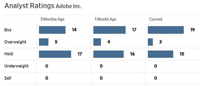 한편 어도비 주가는 올 들어 52% 급등한 가운데 지난 6월부터 월가의 목표가 상향이 본격화되고 있다. 특히 최근에는 어도비에 대해 ‘중립’ 입장을 고수하던 애널리스트들이 ‘매수’ 의견으로 돌아서는 모습이 상당수 관찰되고 있다. 어도비에 대한 월가의 매수의견 비중은 3개월 전 52.8%에서 이달 초 56.8%, 현재 59.5%로 상승했다. 37명 중 22명이 매수(비중확대 및 시장수익률 확대 등 포함) 의견을 제시하고 있는 것. 평균 목표주가도 이달 초 556.6달러에서 현재 559.43달러로 높아졌다. 이날 종가대비 9.3% 높은 수준이다.