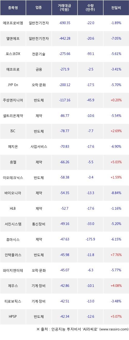 외국인 투자자의 순매도 상위 20개 종목은 에코프로비엠, 엘앤에프, 포스코DX, 에코프로, JYP Ent., 주성엔지니어링, 셀트리온제약, ISC, 메지온, 휴젤등이다.