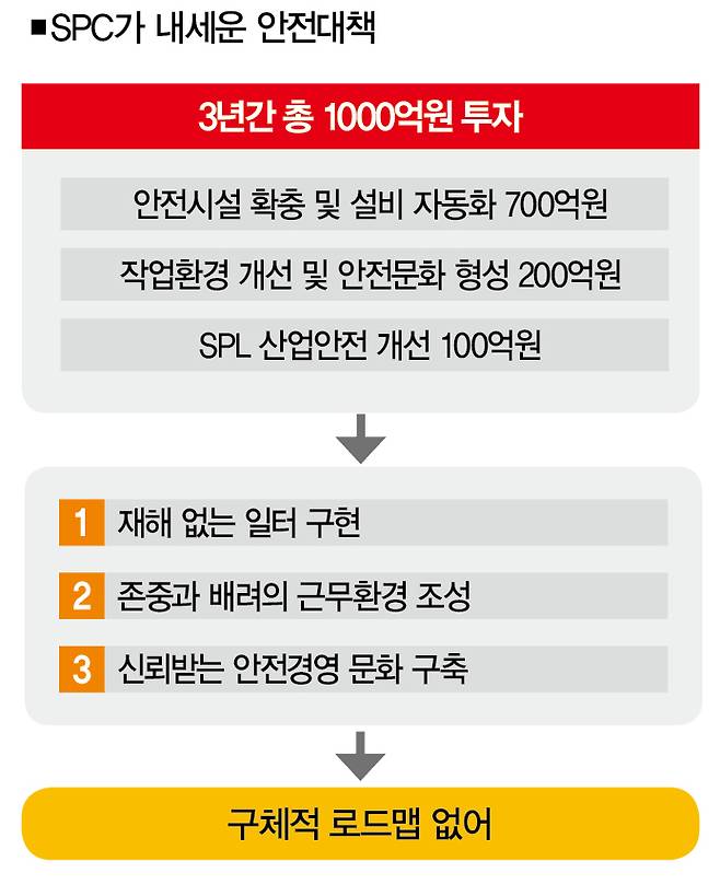 그런데 어찌 된 일인지 "안전경영을 위해 1000억원을 투자한다"는 계획의 실행 방안을 담은 구체적인 로드맵은 내놓지 않았다. SPC 측은 지난 4월에야 "안전장비 도입·시설보수·작업환경 개선 등에 165억원을 투자했다"면서 "올해 말까지 450억원을 추가로 투자해 ISO 45001 인증 확대·외부 안전진단 실시를 한다"는 계획을 밝혔지만, 턱없이 허술한 밑그림이란 비판을 받았다.