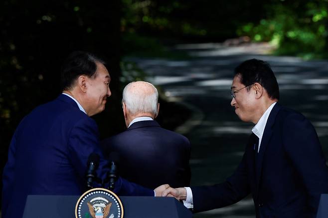 | ▲ 윤석열 한국 대통령(사진 왼쪽)과 기시다 후미오 일본 총리가 2023년 8월 18일 미국 메릴랜드주 서먼턴 인근 캠프 데이비드에서 열린 한미일 3국 정상회담 공동기자회견을 마친 뒤 악수를 하고 있다. |
