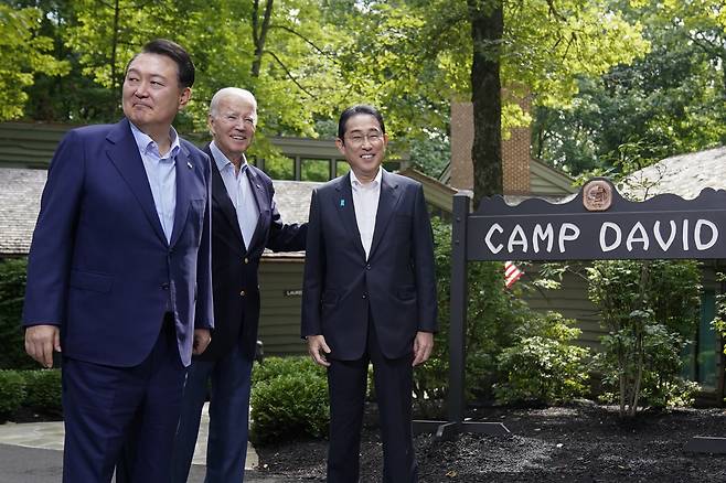 | ▲ 윤석열 한국 대통령과 조 바이든 미국 대통령, 기시다 후미오 일본 총리가 2023년 8월 18일 금요일 메릴랜드주 서몬트 인근의 캠프 데이비드에서 만나고 있다. |