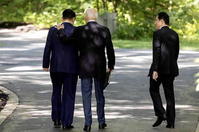 | ▲ 왼쪽부터 윤석열 한국 대통령, 조 바이든 미국 대통령, 기시다 후미오 일본 총리가 2023년 8월 18일 미국 메릴랜드주 프레드릭 카운티 캠프 데이비드에서 3국 정상회담의 일환으로 공동 기자회견을 마친 뒤 돌아가고 있다. |