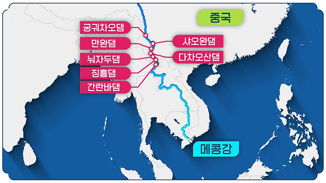 중국 티베트에서 발원해서 미얀마, 라오스, 태국, 캄보디아를 거쳐 베트남을 가로지릅니다. 이 강에 의지해 먹고사는 인구가 많다 보니 이해관계가 얽히기라도 하는 날에는 해당 국가 정부와 국민들 모두 아주 날카롭게 반응합니다.
