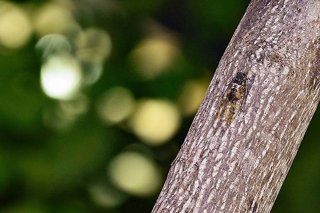 서울의 콘크리트 숲속, 나무에 붙어있는 매미가 밤늦은 시간까지 우렁찬 울음소리를 내고 있다.