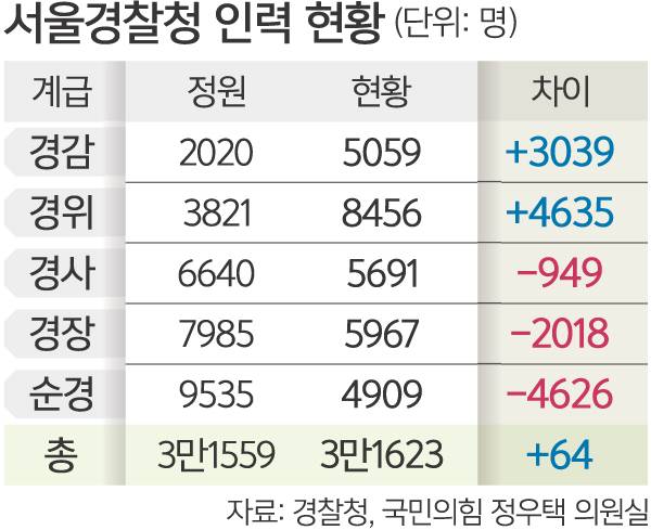 반면 낮은 직급에서는 현원이 정원에 크게 못 미쳤다. 경사는 정원(6640명)보다 949명 적은 5691명, 경장은 정원(7985명)보다 2018명 부족한 5967명으로 집계됐다. 특히 순경은 정원(9535명) 대비 절반이 결원인 4909명만이 근무 중인 것으로 나타났다.