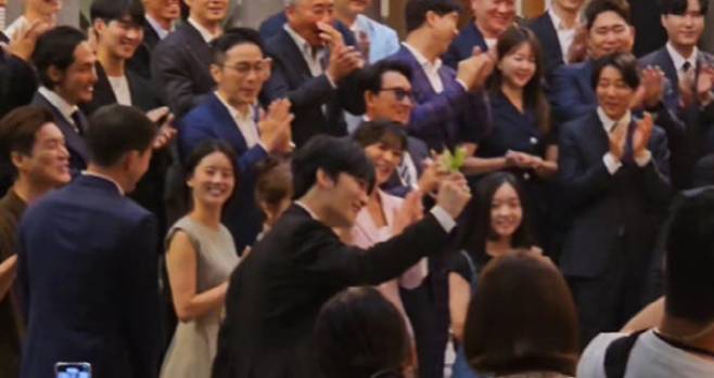 가수 김재중이 배우 심형탁과 일본인 아내 히라이 사야의 한국 결혼식에서 부케를 받아 화제다.