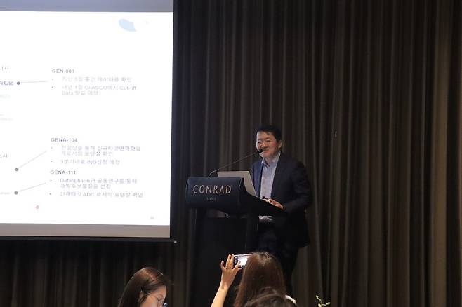 (서울=연합뉴스) 배지수 지놈앤컴퍼니 대표가 21일 서울 영등포구 콘래드 서울 호텔에서 열린 기자간담회에서 발표하고 있다. 2023.8.21 [지놈앤컴퍼니 제공. 재판매 및 DB 금지]