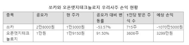 쏘카는 현재 주가가 공모가 대비 반토막이 나면서 손실이 불가피한 상황이다. 반대로 오픈엣지테크놀로지는 공모가보다 2배 가까이 올라 큰 수익이 기대되고 있다.