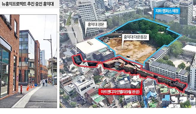 지하 캠퍼스 조성을 앞두고 다음달 ‘아트앤디자인밸리’가 완공될 예정이다. ‘홍대벽화거리’로 유명했던 골목길 중 학교 쪽 담벼락을 부수고 만들었다. 건물이 성벽처럼 250m 정도 일자로 길게 늘어선 형태다. 10월부터 72개의 디자인 창업 공방, 팝업스토어, 갤러리 등이 들어선다. 지하 캠퍼스 조성 공사 과정에서 아트앤디자인밸리를 지하 공간과 연결한다는 구상이다.