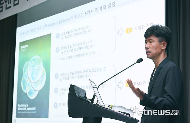 지놈앤컴퍼니가 21일 서울 여의도 콘래드호텔에서 기자간담회를 열고 개발 중인 신규타깃 항암제 파이프라인 현황과 계획을 발표했다. 홍유석 지놈앤컴퍼니 총괄대표가 바이오텍 성공모델과 지놈앤컴퍼니의 전략에 대해 발표하고 있다.