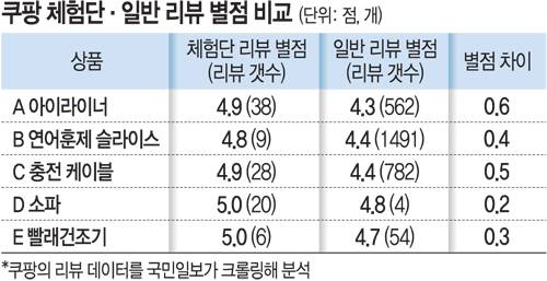 21일 국민일보가 쿠팡에서 판매 중인 식품·전자기기·화장품·생활용품 등 13개 상품의 리뷰를 크롤링(웹페이지 데이터 추출)해 분석한 결과 체험단 리뷰의 평점이 일반 리뷰 평점보다 높은 것으로 나타났다.