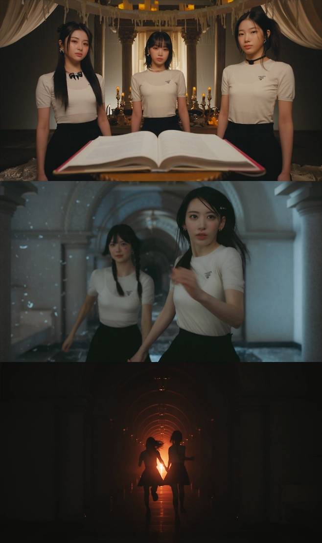 신비한 분위기가 감돌았다. 김채원, 허윤진, 카즈하는 낡은 책을 향해 발을 내딛었다. 사쿠라가 홍은채의 손을 잡고 전력 질주하는 모습도 담겼다.