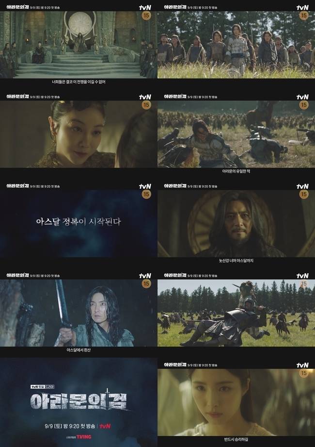이어 허공을 가르며 날쌔게 몸을 날리는 이나이신기 은섬의 모습을 시작으로 아스달을 정복하겠다는 선전포고가 대평원에 가득 울려 퍼진다. 이나이신기는 200년 전 유일하게 아라문해슬라를 이겨 신성화된 아고족의 영웅. 은섬은 폭포의 심판을 통과해 재림 이나이신기의 칭호를 얻은 바. 그의 말 한마디 한마디에는 용광로처럼 뜨거운 결의가 묻어나고 있어 보는 이들의 가슴을 웅장하게 만든다.