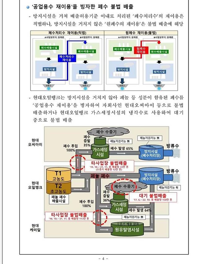 또 2016년 11월부터 2021년 11월까지 5년여 동안 이미 사용한 폐수 113만 톤을 재활용을 빙자해 방지시설을 거치지 않고 자회사인 현대캐미칼로 불법 배출하고, 폐수 33만 톤을 방지시설을 거치지 않고 현대오씨아이 공장으로 배출(2019.10~2021.11)한 혐의도 받고 있다.