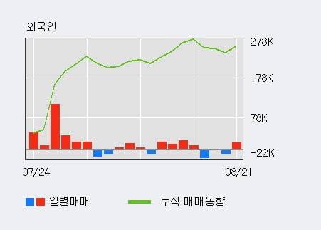 지난 한달을 기준으로 보면 외국인이 25.9만주를 순매수했고, 기관도 252주를 순매수했다. 반면 개인들은 26.6만주를 순매도한 것으로 나타났다. 같은 기간 거래 비중은 개인이 77.0% 로 가장 높고, 외국인은 20.7%로 그 뒤를 이었다. 기관은 거래에 거의 참여하지 않은 것으로 보인다.