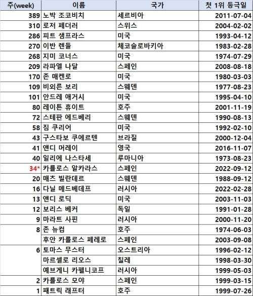 ATP 랭킹 1위 관련 각종 기록들