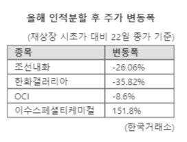 다만 인적분할 뒤에도 주가가 강세를 이어갈 지는 미지수다. 최근 인적분할을 단행한 기업들의 주가가 약세를 보이고 있기 때문이다. 올해 인적분할로 신설된 조선내화와 한화갤러리아는 이날 재상장 시초가 대비 26.06%, 35.82% 하락세를 나타냈다.